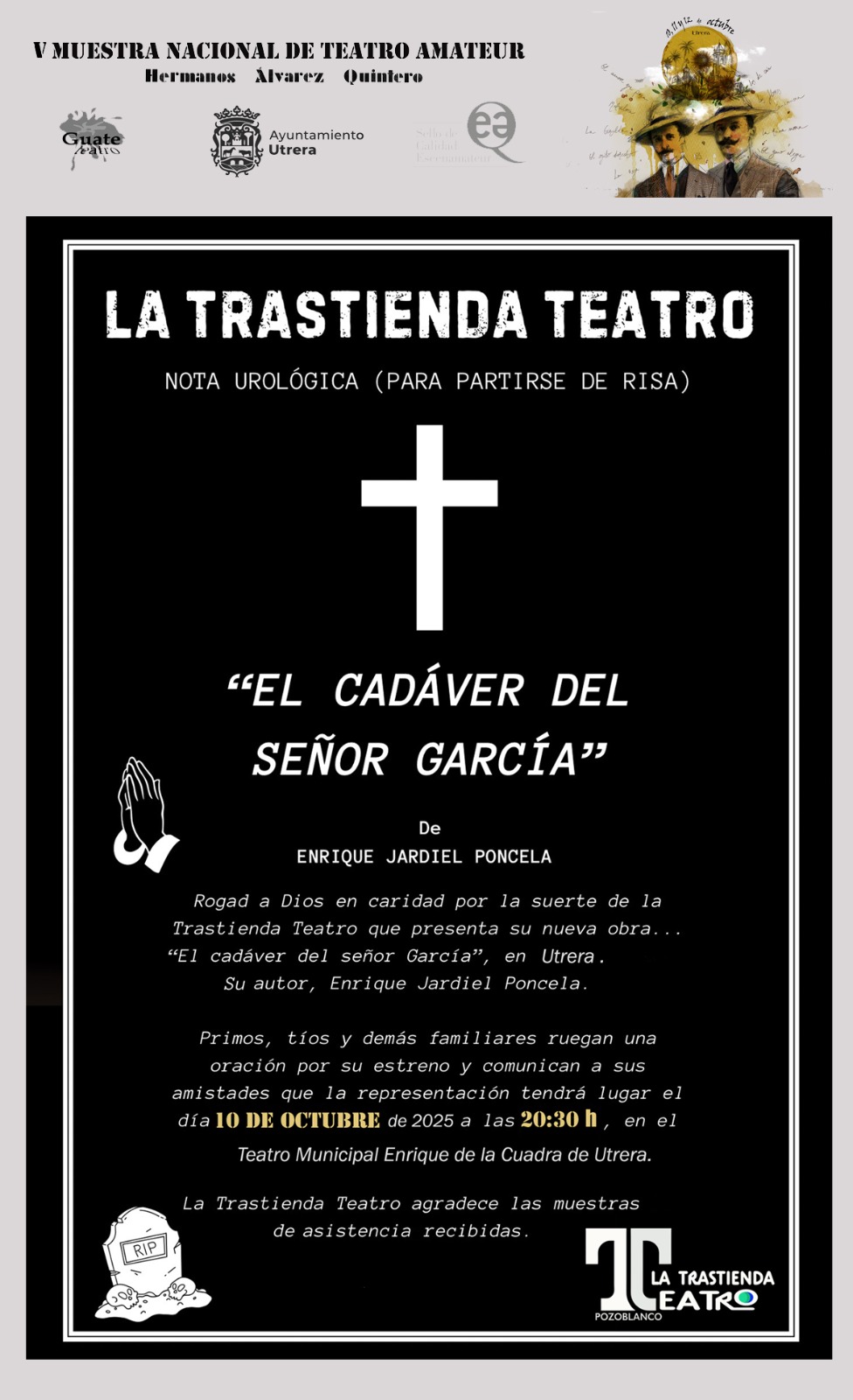 Dos comedias y un drama de suspense. Las tres obras de la V Muestra Nacional de Teatro Amateur hermanos Álvarez Quintero llegan a Utrera para hacernos pasar un fin de semana inolvidable. Del 10 al 12 de octubre, a las 20:30 horas, los amantes del teatro tienen una cita ineludible en el Enrique de la Cuadra de Utrera, que será para el puente del Pilar el epicentro de la calidad y variedad de propuestas escénicas que realizan actualmente en España las compañías amateurs de teatro.