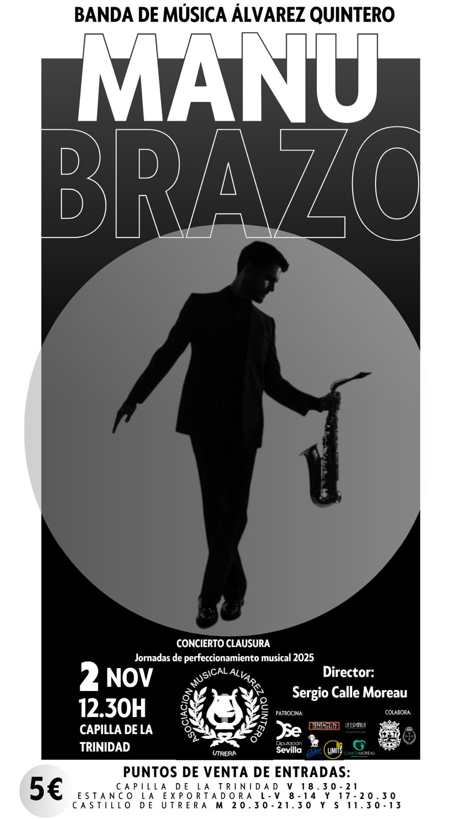 Este domingo 2 de noviembre a las 12.30h tiene lugar el concierto de Clausura de las Jornadas de Perfeccionamiento Musical que organizaron durante este mes de octubre la Asociación Musical Álvarez Quintero. En dicho concierto en la capilla de la Trinidad, escucharemos al utrerano Manu Brazo, prestigioso saxofonista internacional y solista, acompañado por la banda de la asociación.