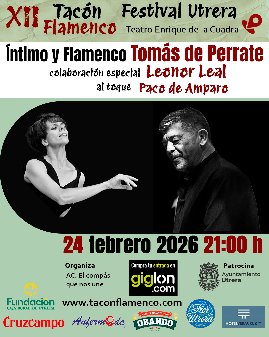 El XII Festival Tacón Flamenco de Utrera, que junto al del Mostachón y el Potaje Gitano, es uno de los tres grandes festivales flamencos de nuestra ciudad, organizado por la Asociación «El Compás que nos une», se celebrará del 22 al 28 de febrero de 2026 y este año rendirá un homenaje especial a la esencia y la pureza del «baile de Jerez de la Frontera». Desde el mes de diciembre se encuentran a la venta sus entradas en la Plataforma Giglon.