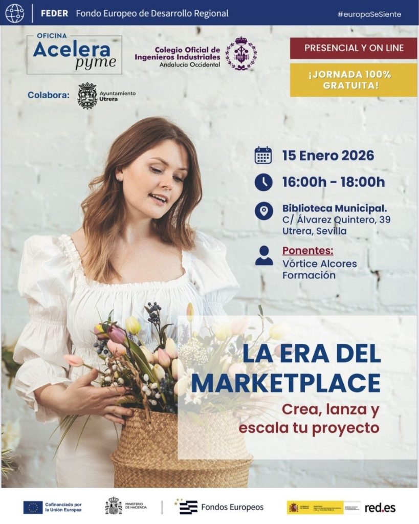La Delegación de Formación y Empleo del consistorio utrerano ha propuesto un nuevo encuentro formativo centrado en el comercio electrónico y el uso de plataformas digitales, bajo el título “La era del Marketplace: crea, lanza y escala tu proyecto”, que será impartido por Vórtice Alcores Formación. El encuentro se celebrará el 15 de enero, en horario de 16:00 a 18:00 horas, en la Biblioteca Municipal de Utrera, y podrá seguirse tanto de manera presencial como online. La participación es totalmente gratuita, aunque requiere inscripción previa.