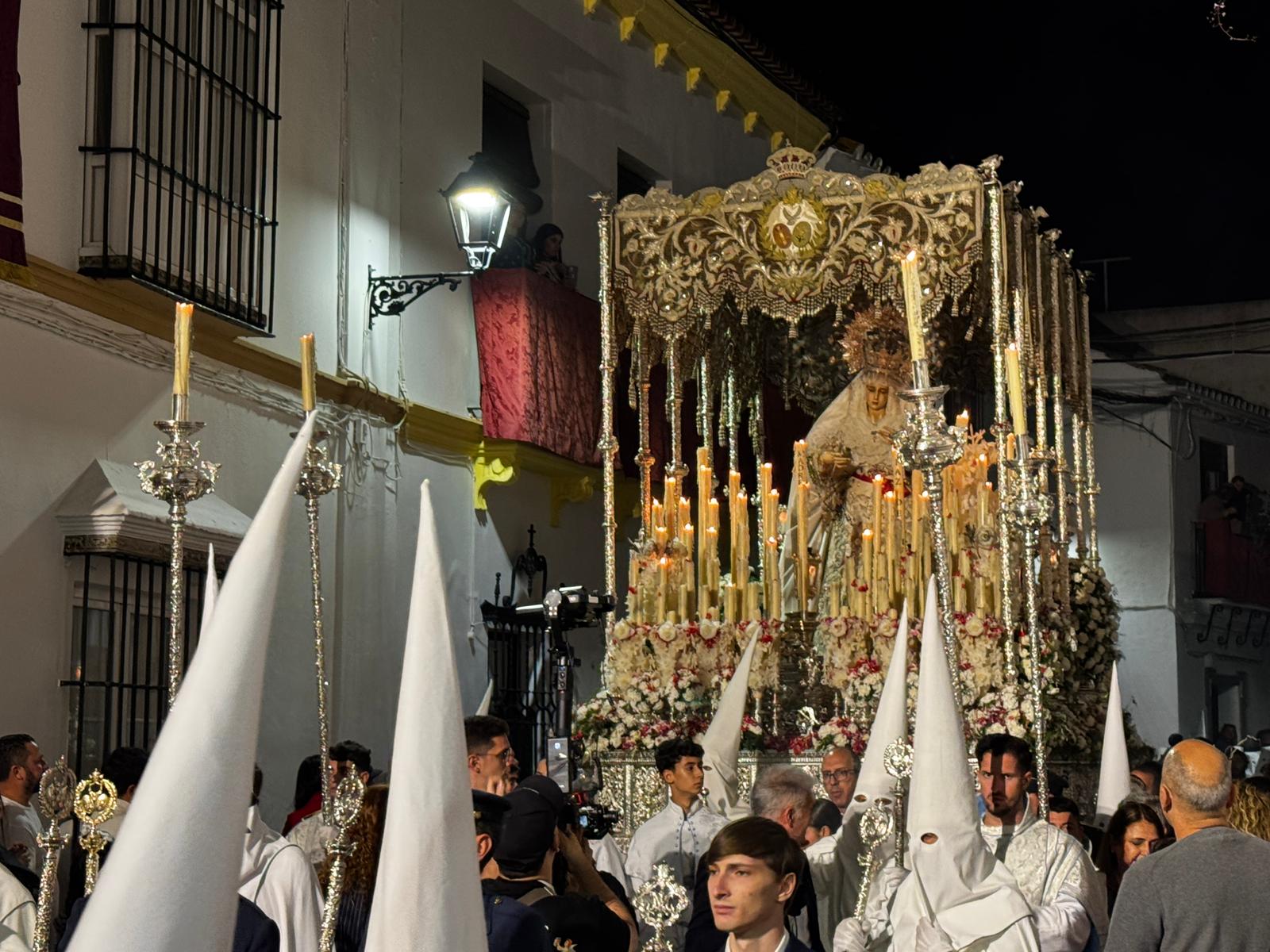 La tarde del Miércoles Santo 1 de abril se vistió de blanco en Utrera con el discurrir de la Hermandad de los Aceituneros, fundada en 1959 por miembros del sector de la aceituna de la localidad y pionero en dar igualdad a la mujer para participar en la cofradía como nazarenas. Siendo la Hermandad más numerosa en cuanto a nazarenos en sus calles esa tarde, Utrera se llenó de blanco y verde para acompañas a Nuestro Padre Jesús Atado a la Columna y María Santísima de la Paz.