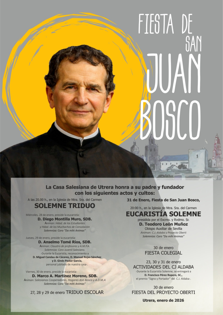 La Casa Salesiana de Utrera conmemorará durante el mes de enero la Fiesta de San Juan Bosco, padre y fundador de la familia salesiana, con un amplio programa de actos religiosos, escolares y solidarios que se desarrollarán entre los días 23 y 31 de enero de 2026. La celebración principal será el Solemne Triduo, que tendrá lugar a las 20:00 horas en la Iglesia de Nuestra Señora del Carmen a partir del miércoles 28 de enero, donde presidirá la eucaristía Diego Montilla Muro, SDB, el jueves 29 lo hará Anselmo Tomé Ríos y el viernes 30 estará a cargo de Marco A. Martínez Moreno. Todas las celebraciones estarán solemnizadas por coros de la comunidad salesiana. Además, durante el triduo se rendirá reconocimiento a miembros destacados de la casa salesiana.