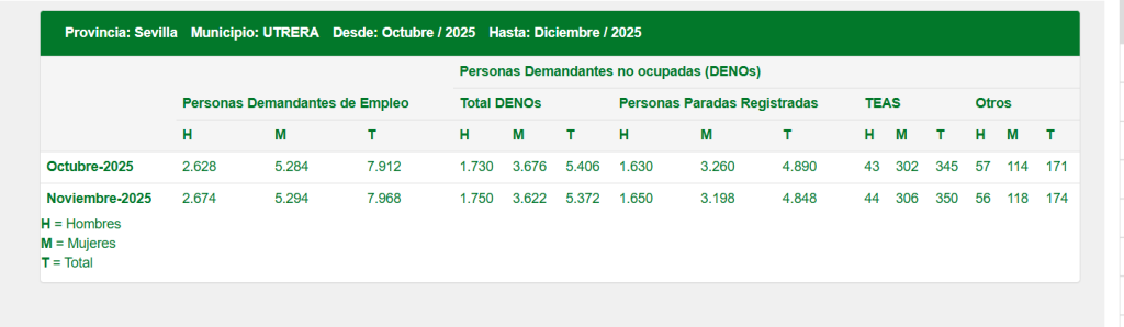 A pesar de que noviembre no ha sido un buen mes para las cifras de paro, Utrera registró un nuevo descenso el pasado mes, con lo que la tendencia es la bajada del número de desempleados, además de mantenerse por debajo de las 5.000 personas. Aunque el paro descendió con respecto al mes de octubre, en noviembre aumentó la cifra de paro en hombres, que pasó de 1.630 a 1.650 (+20), y lo que realmente hizo que la cifra descendiera con respecto a octubre fue el paro femenino que pasó de las 3.260 mujeres de octubre a las 3.190 de noviembre (-70). Así, las cifras totales son 4.890 parados en octubre y 4.848 en noviembre, arrojando un descenso total de 42 personas.