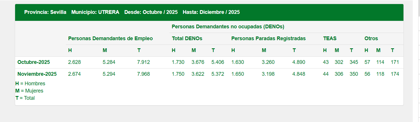 A pesar de que noviembre no ha sido un buen mes para las cifras de paro, Utrera registró un nuevo descenso el pasado mes, con lo que la tendencia es la bajada del número de desempleados, además de mantenerse por debajo de las 5.000 personas. Aunque el paro descendió con respecto al mes de octubre, en noviembre aumentó la cifra de paro en hombres, que pasó de 1.630 a 1.650 (+20), y lo que realmente hizo que la cifra descendiera con respecto a octubre fue el paro femenino que pasó de las 3.260 mujeres de octubre a las 3.190 de noviembre (-70). Así, las cifras totales son 4.890 parados en octubre y 4.848 en noviembre, arrojando un descenso total de 42 personas.