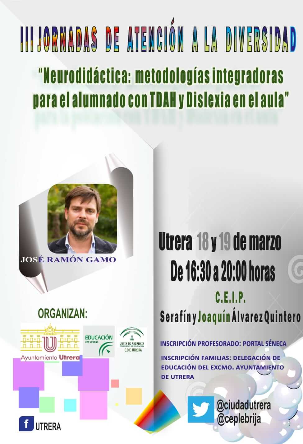 Organizadas por el CEP de Lebrija y la Delegación de Educación del Ayuntamiento de Utrera, durante los días 18 y 19 de marzo se van a desarrollar en el CEIP Álvarez Quintero de Utrera las III Jornadas de Atención a la Diversidad, a través de ellas se pretende ofrecer al profesorado que atiende al alumnado con TDAH y con DISLEXIA, así como a todos los miembros de la comunidad educativa de Utrera, respuestas fundamentadas en la NEURODIDÁCTICA.