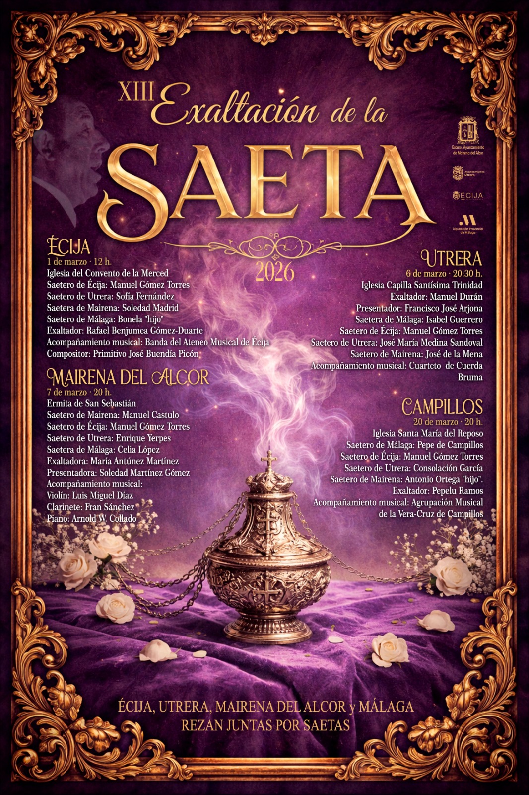 En Utrera, la cita será el 6 de marzo a las 20:30 horas en la Iglesia Capilla Santísima Trinidad. Manuel Durán ejercerá como exaltador, mientras que el delegado Francisco Arjona participará como presentador del acto. Intervendrán los saeteros Isabel Guerrero (Málaga), Manuel Gómez Torres (Écija), José María Medina Sandoval (Utrera) y José de la Mena (Mairena del Alcor), con el acompañamiento musical del Cuarteto de Cuerda Bruma.