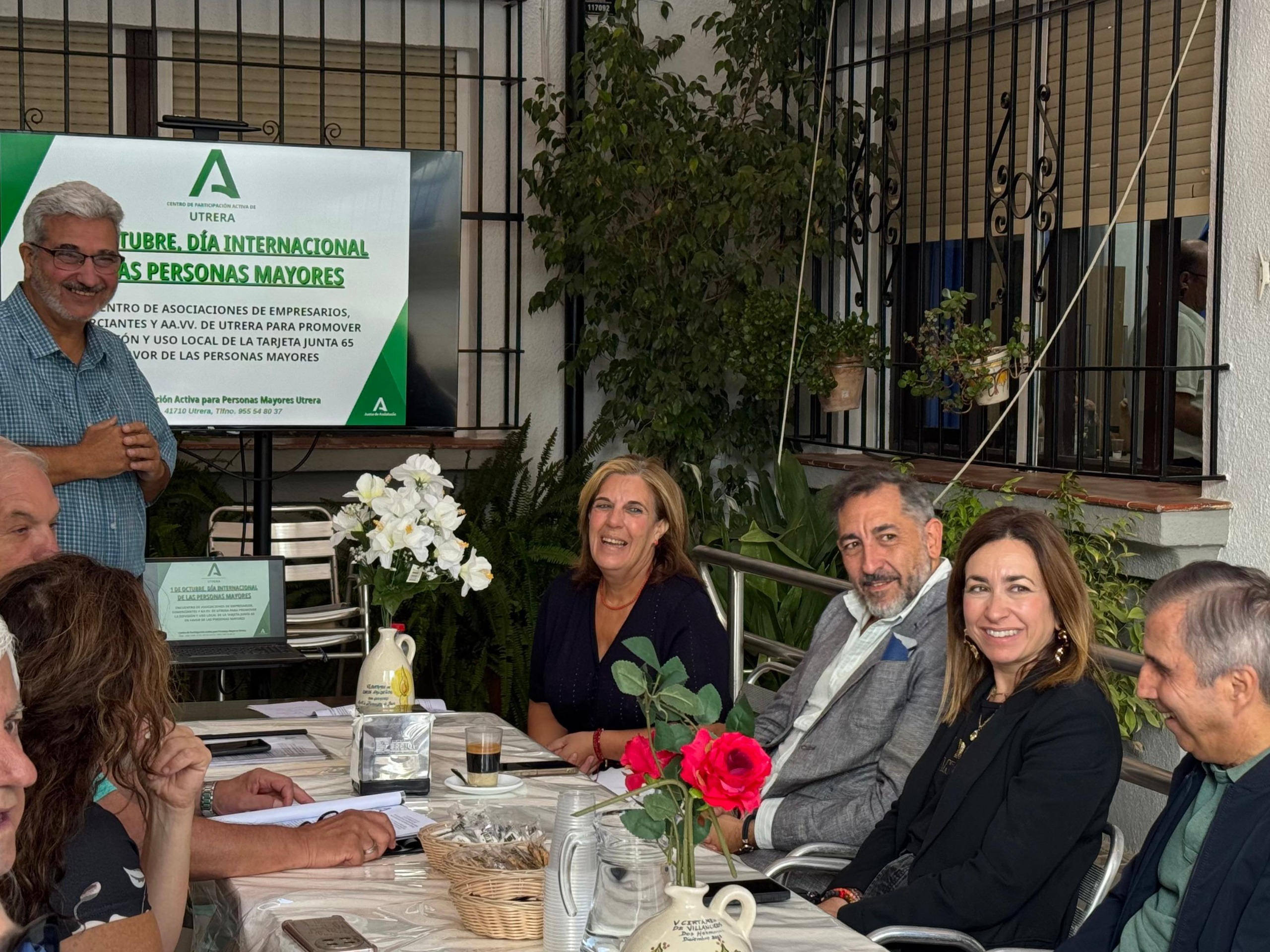 El delegado del Mayor, Francisco Arjona, y la delegada de Reactivación Económica, Isabel González, participaron en el encuentro organizado con asociaciones de empresarios, comerciantes y vecinos de Utrera para difundir las ventajas de la tarjeta Andalucía Junta 65, coincidiendo con la celebración del Día Internacional de las Personas Mayores. Este encuentro tuvo como objetivo dar a conocer una herramienta que, además de mejorar la calidad de vida de las personas mayores, abre nuevas oportunidades de crecimiento para el tejido empresarial utrerano.